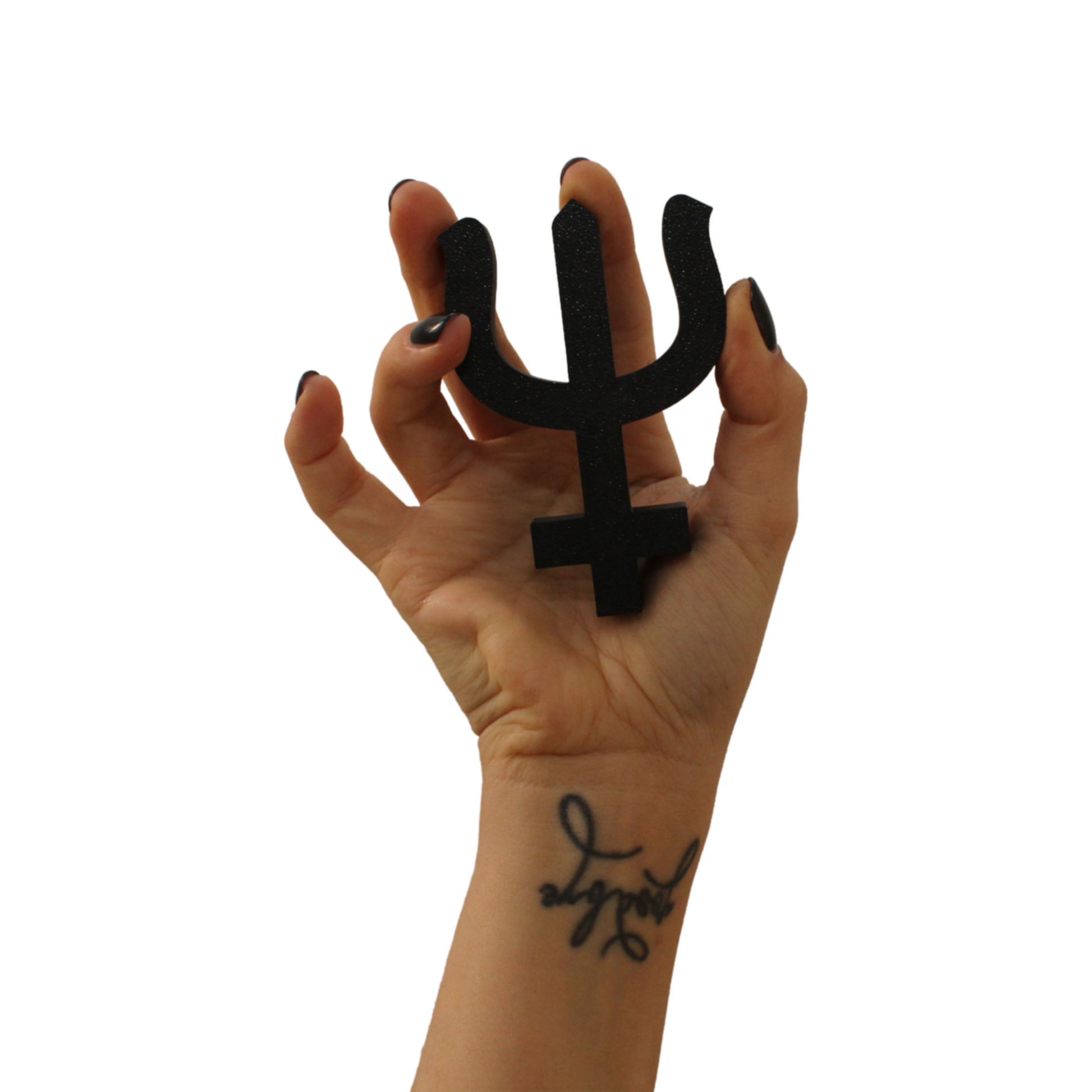 Wall lamp with alchemical symbol of Neptune, 3D printed in PLA (plant-based bioplastic) . Keep it away from heat sources (so avoid prolonged exposure to the sun)!